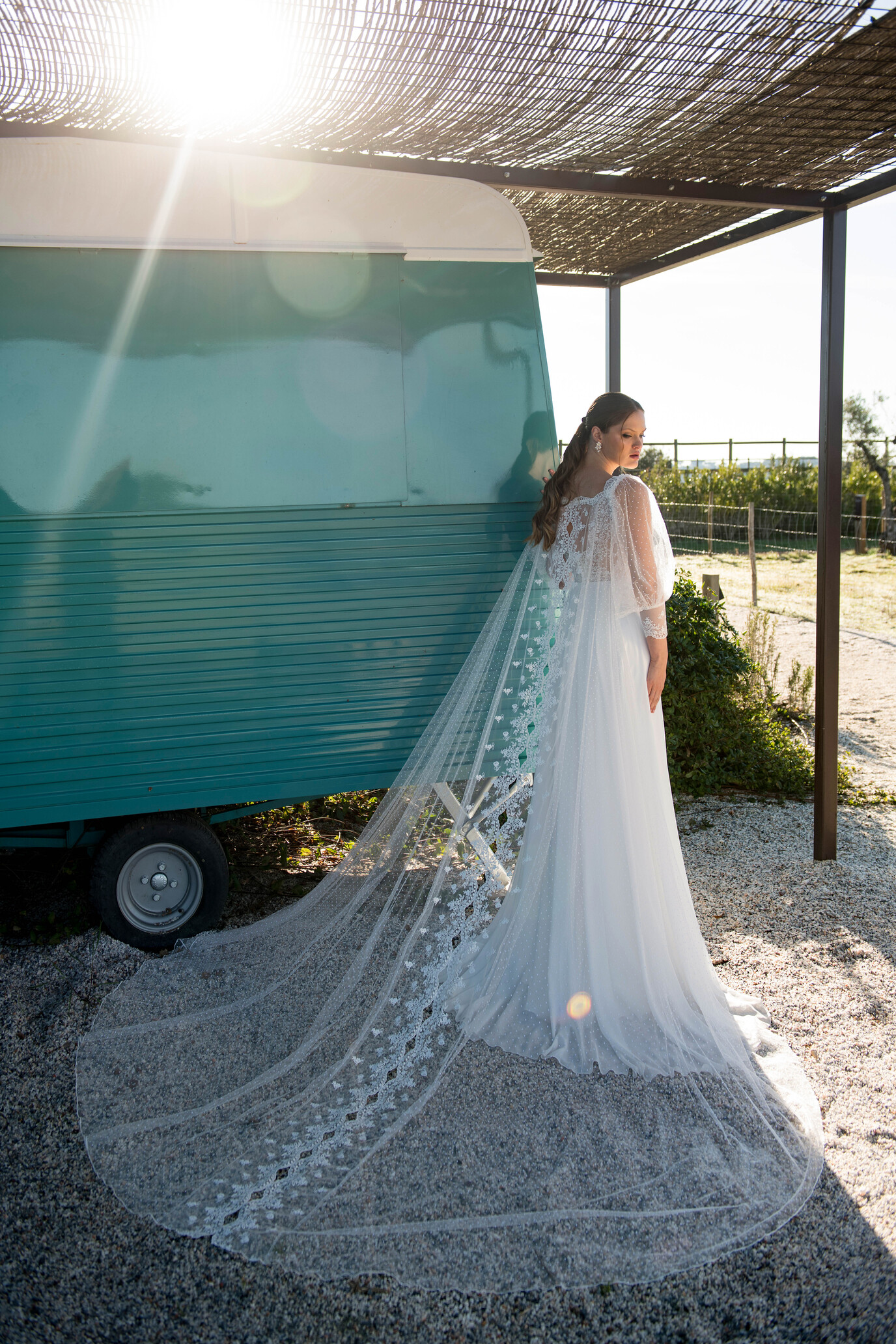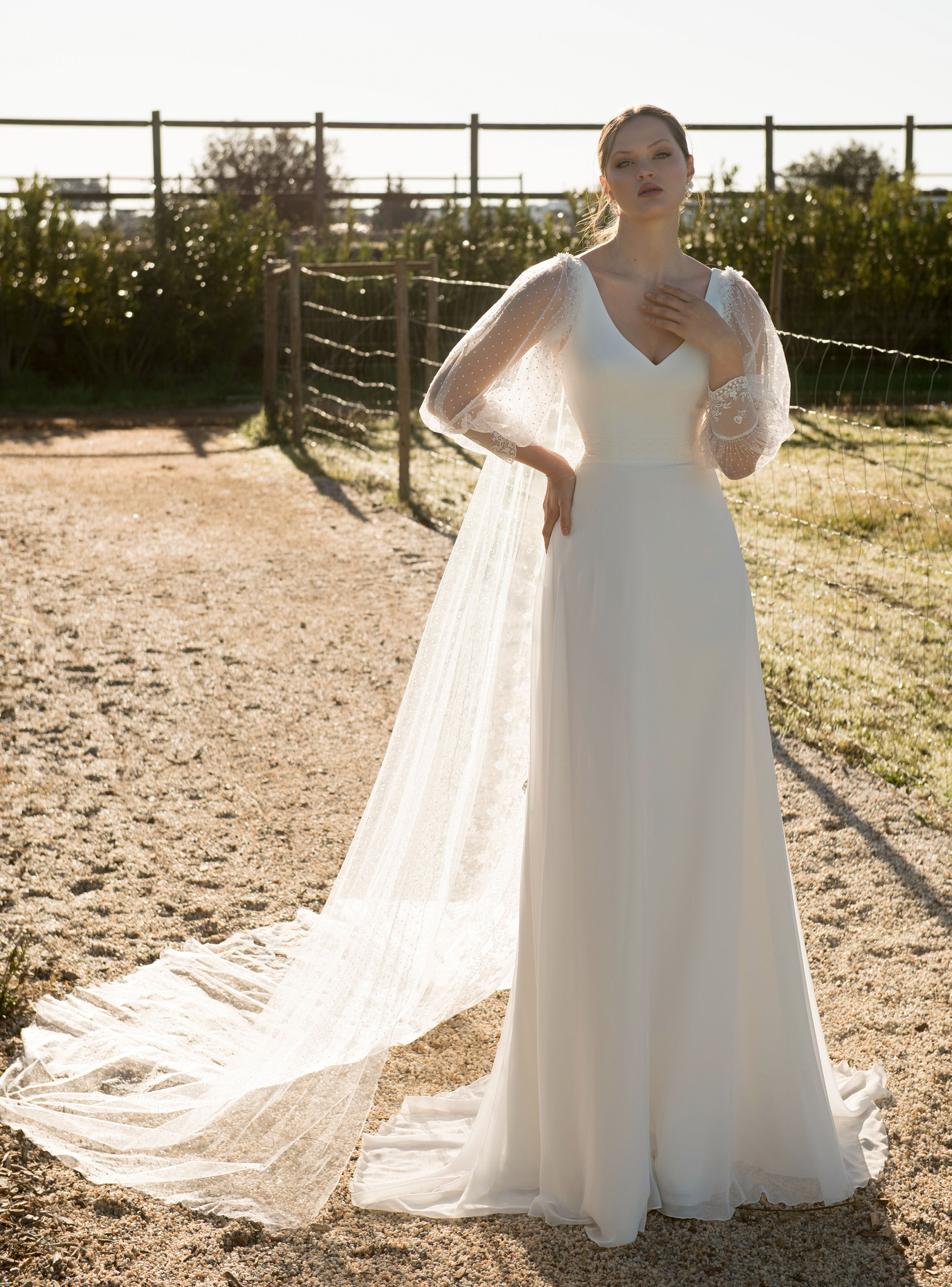 A capa do modelo 307, criada em tule de bolinhas e renda na tonalidade pérola, é mais do que um acessório — é uma extensão da personalidade da noiva. O seu design fluido transforma instantaneamente o look, oferecendo movimento e um toque etéreo a cada passo.