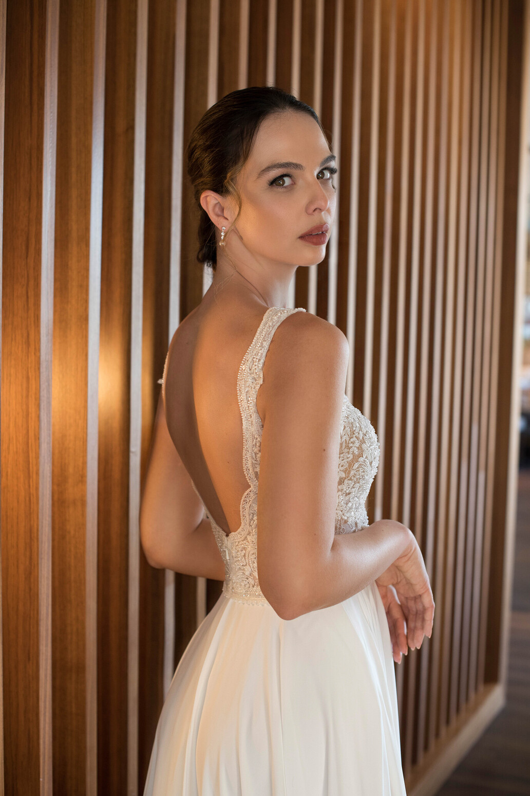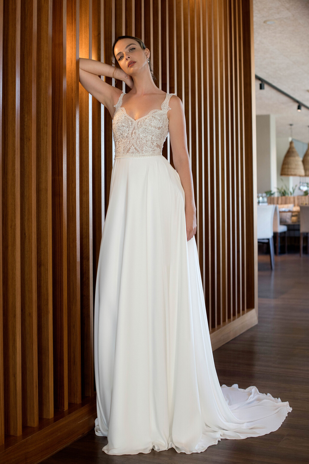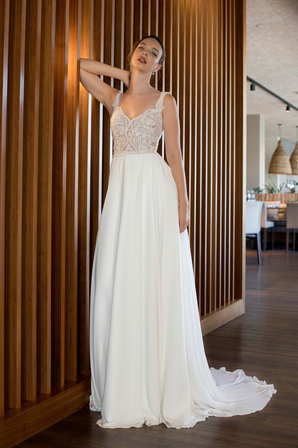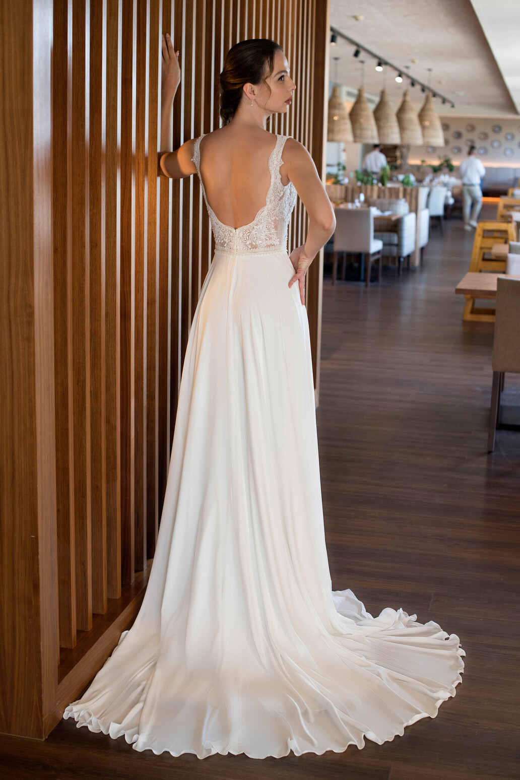 Os detalhes em renda conferem um toque de romantismo discreto, sem sobrecarregar o visual, tornando este modelo ideal para cerimónias intimistas, ao ar livre ou para quem procura um look clean e intemporal.