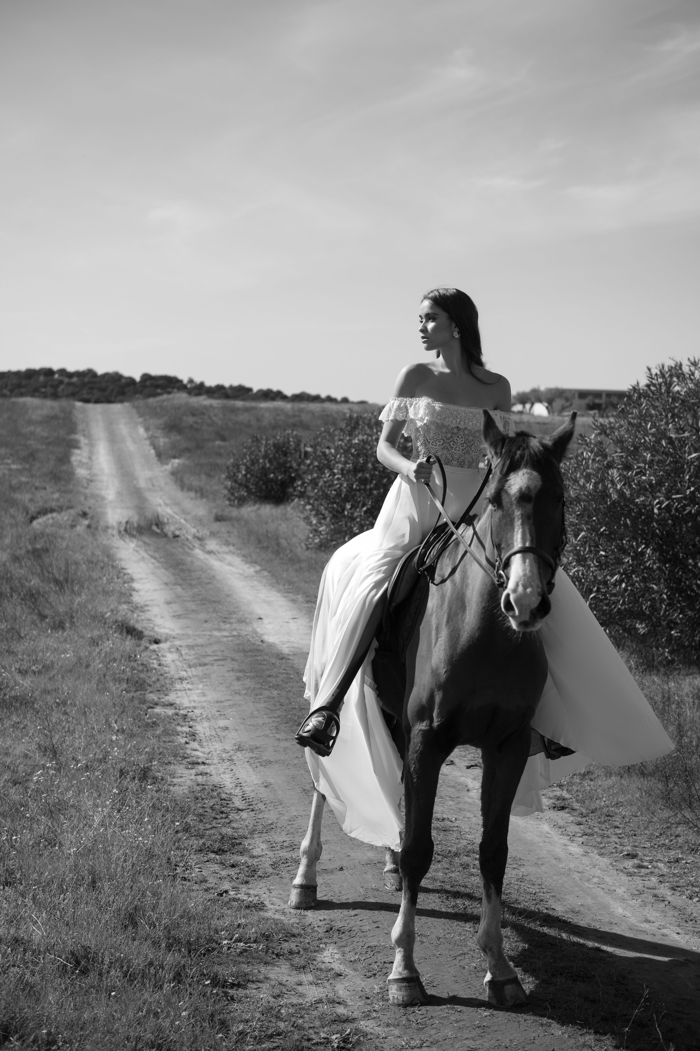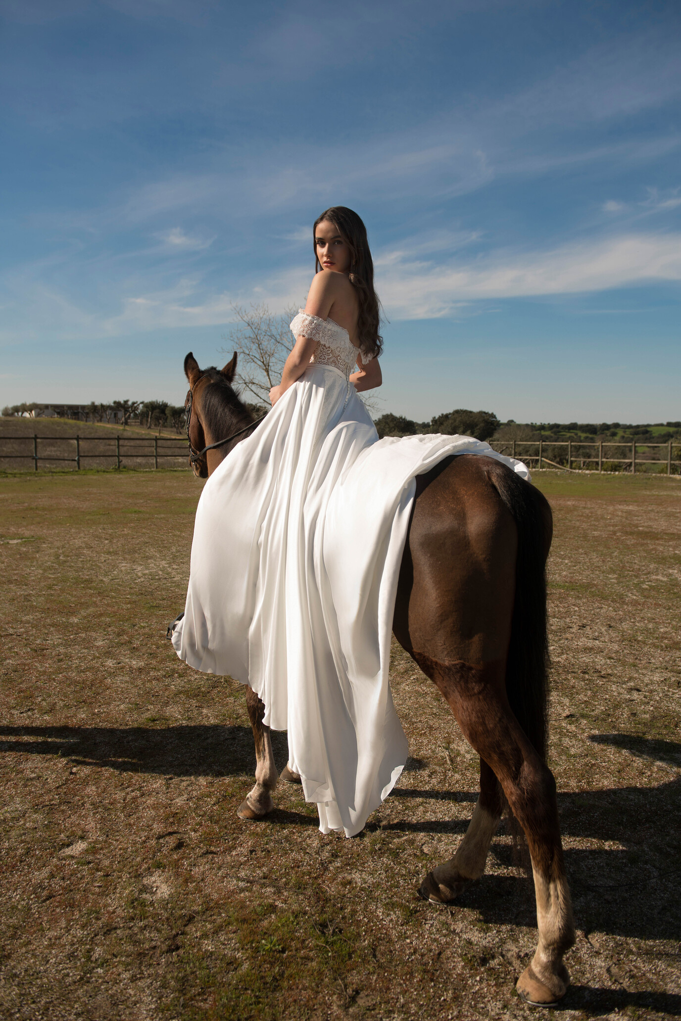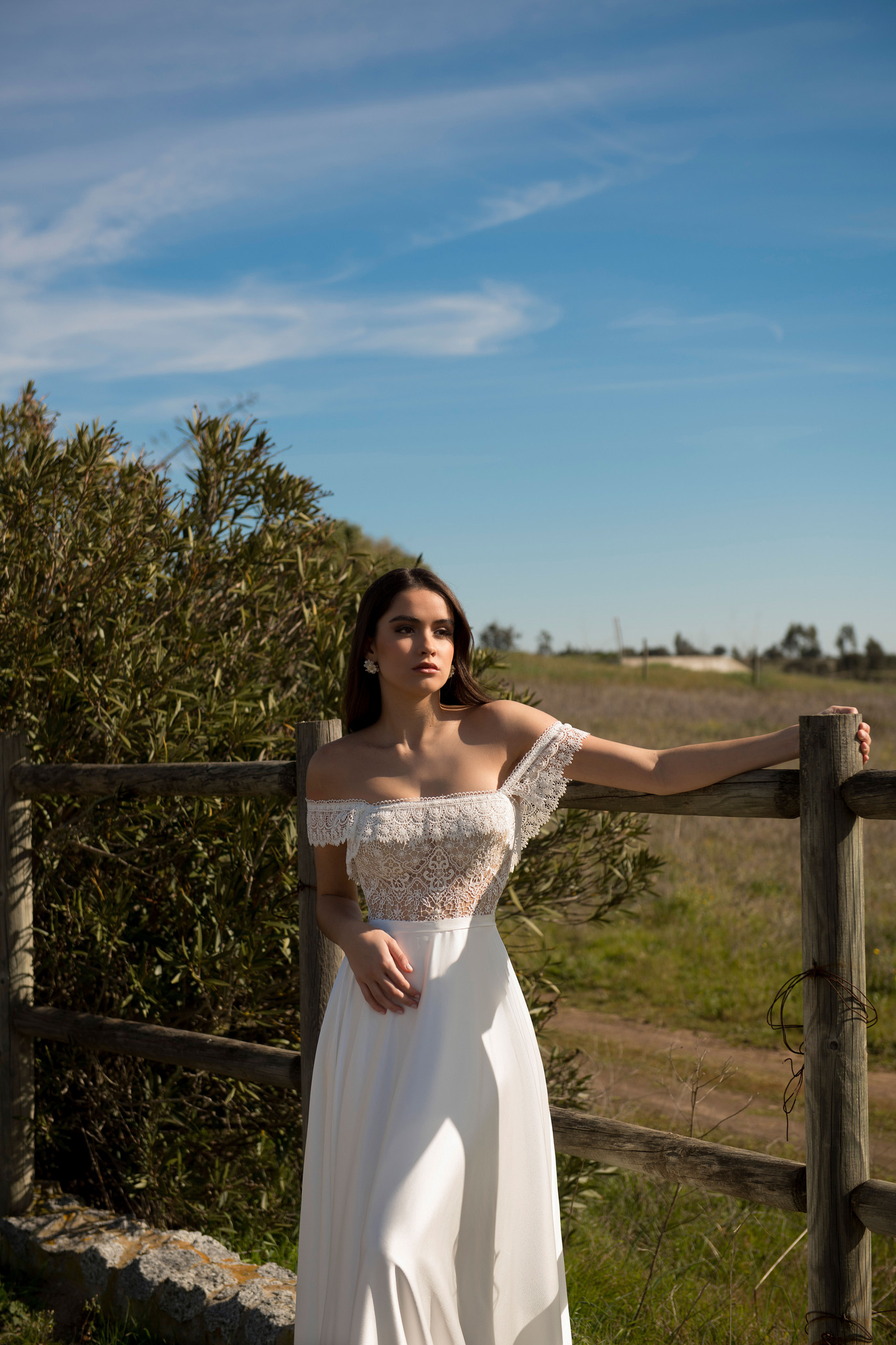 Um vestido de noiva leve e encantador, pensado para a noiva que procura simplicidade com um toque de romantismo boémio.