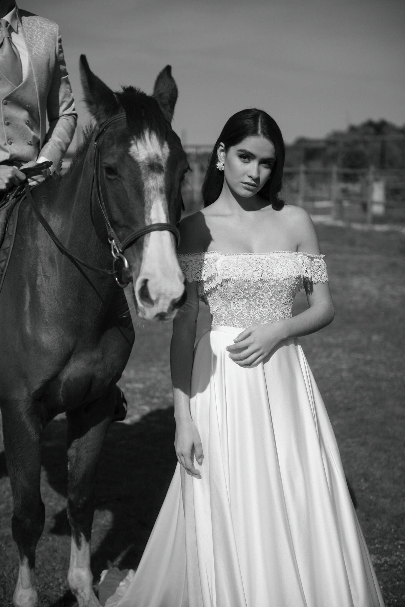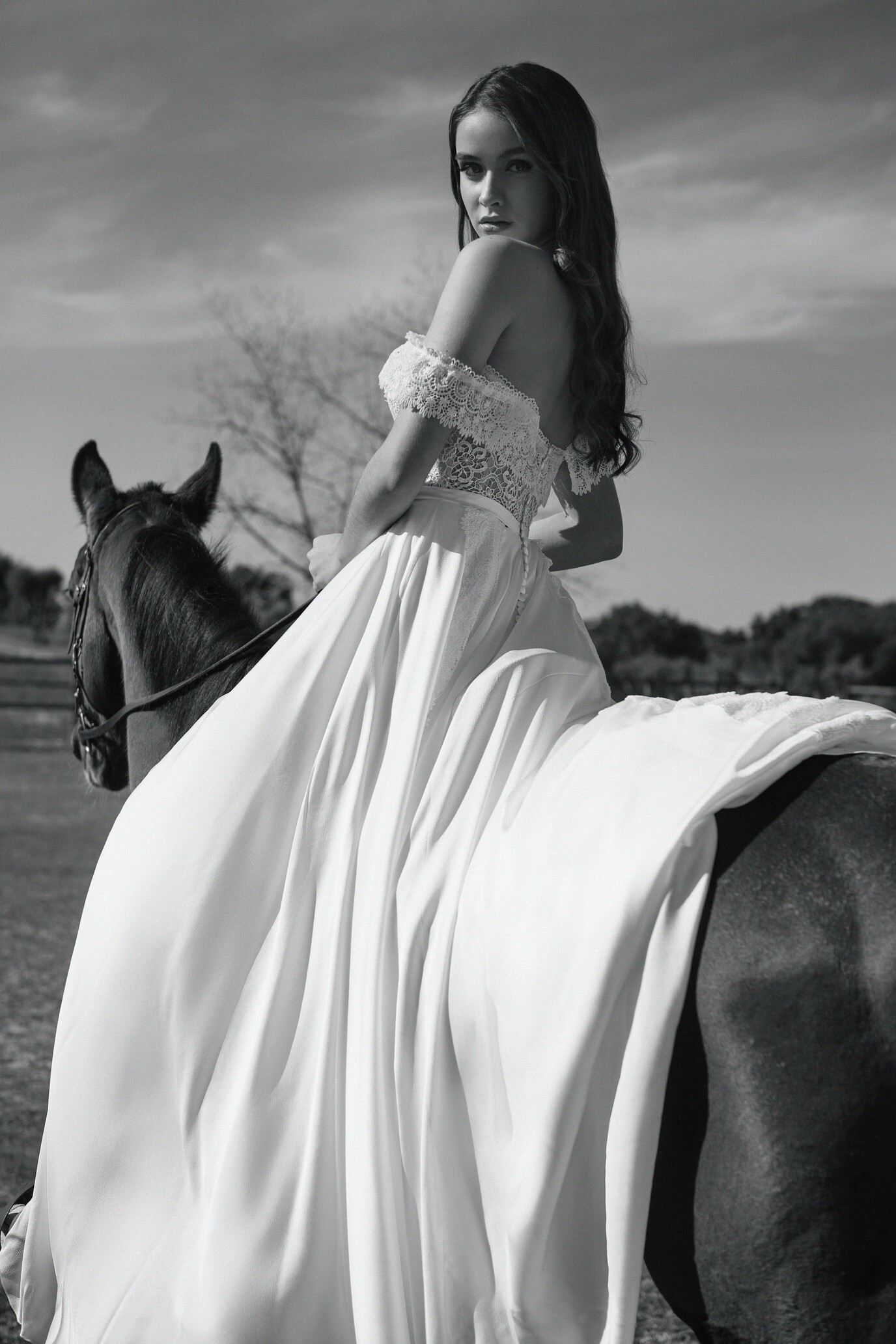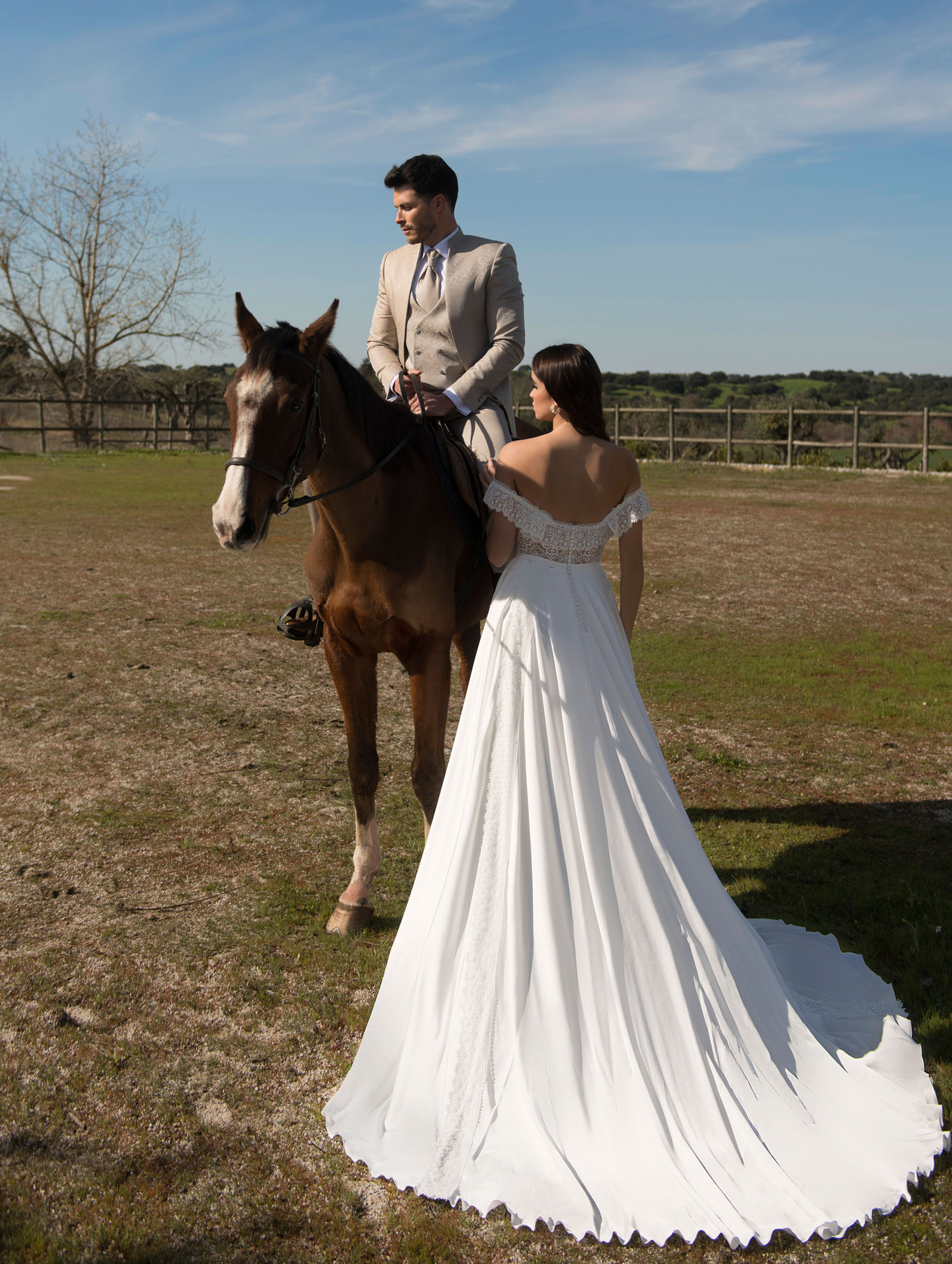 Um vestido de noiva leve e encantador, pensado para a noiva que procura simplicidade com um toque de romantismo boémio.