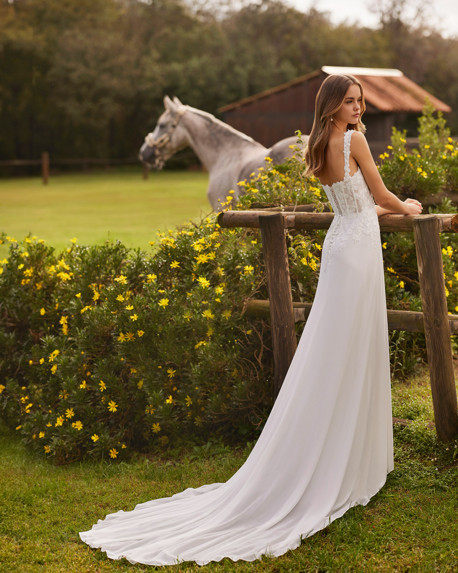 Descubra a elegância intemporal do modelo NELSIA, um vestido de noiva longo, de corte reto, ideal para noivas que procuram sofisticação com leveza.