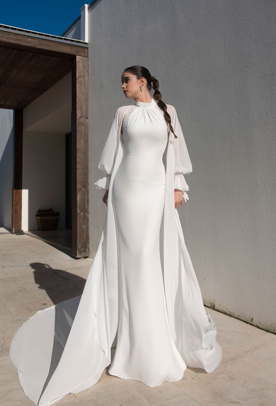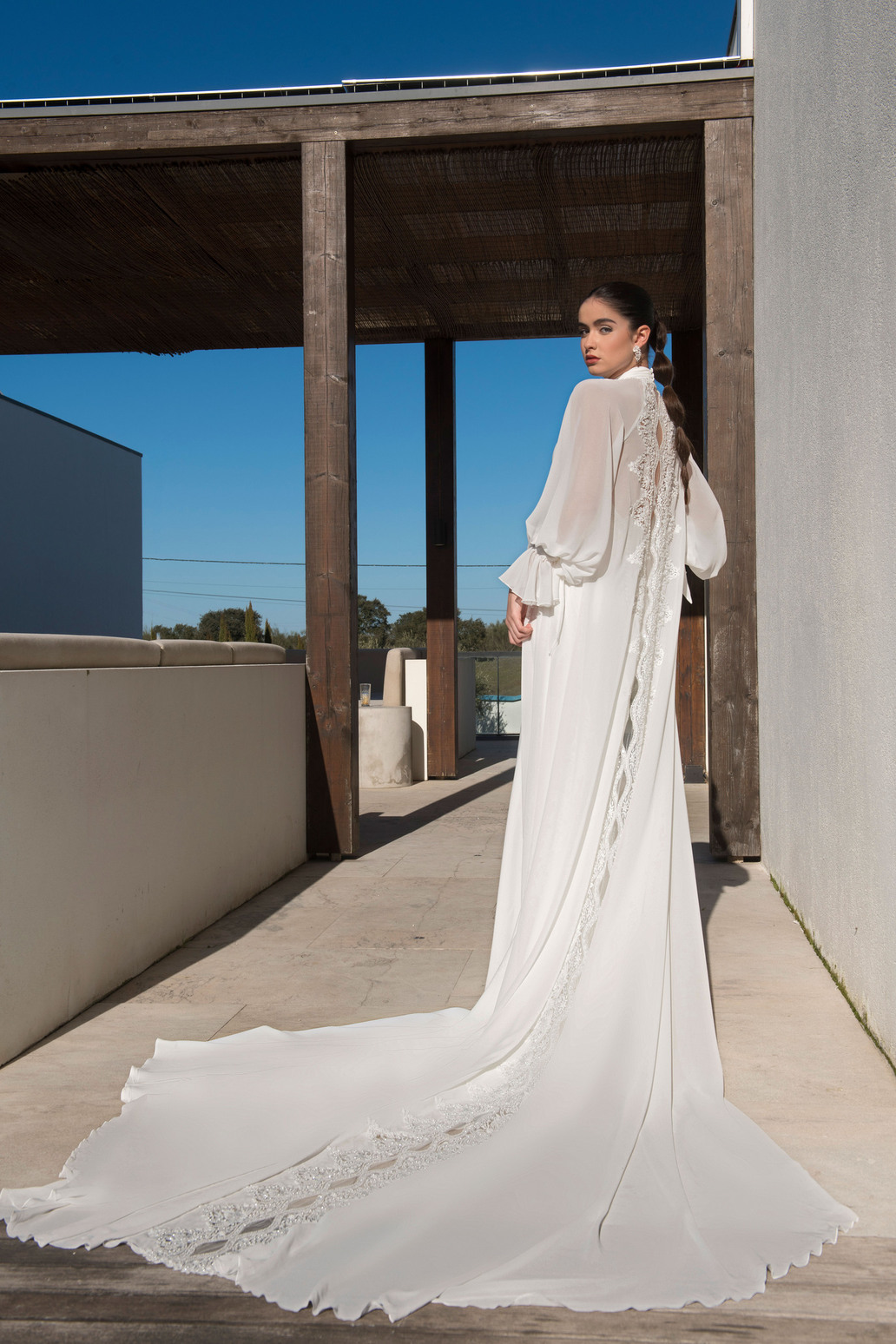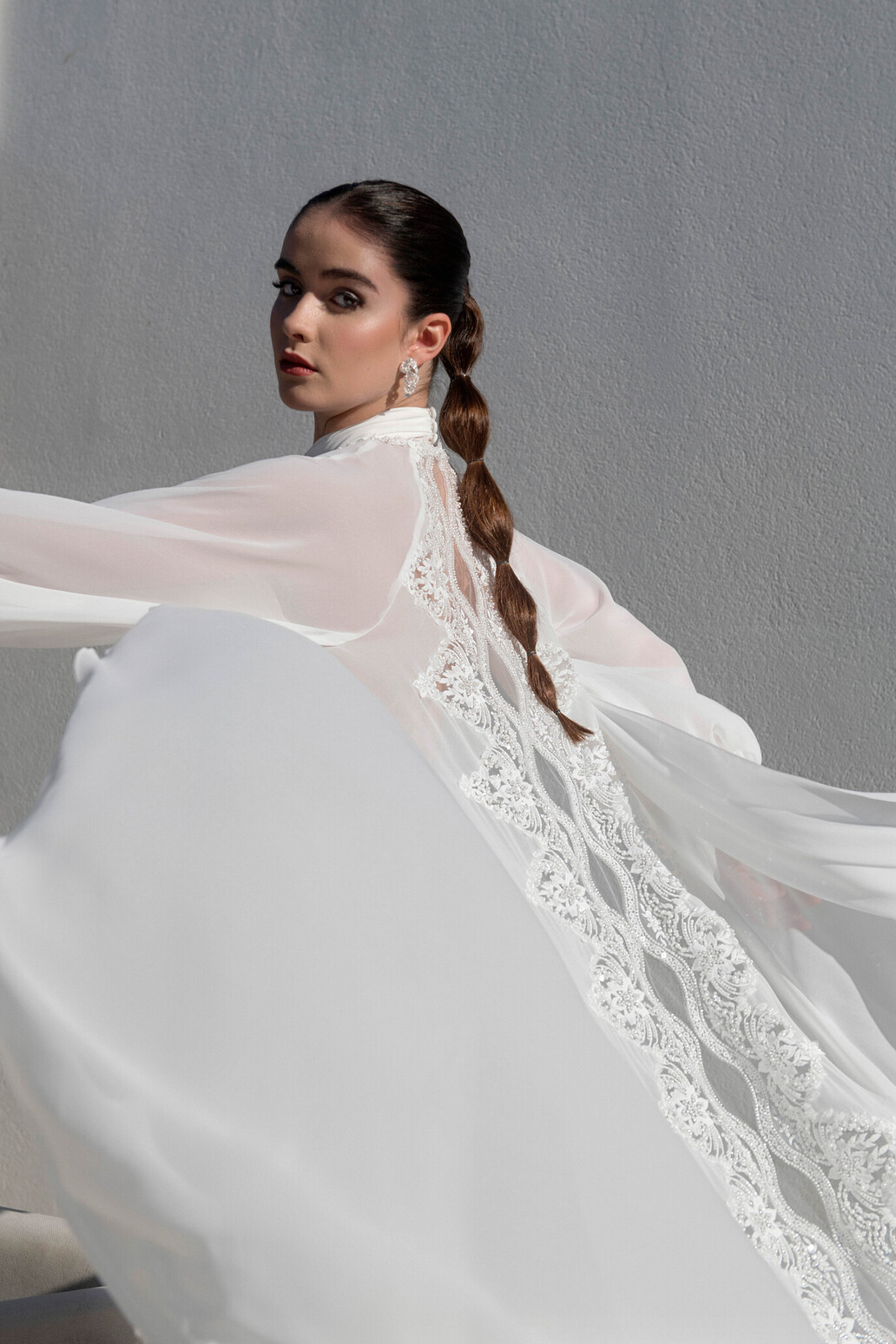 Um complemento delicado e etéreo para transformar qualquer vestido de noiva. Esta capa em mousseline e renda do modelo 321 confere leveza, movimento e um toque de sofisticação à silhueta.