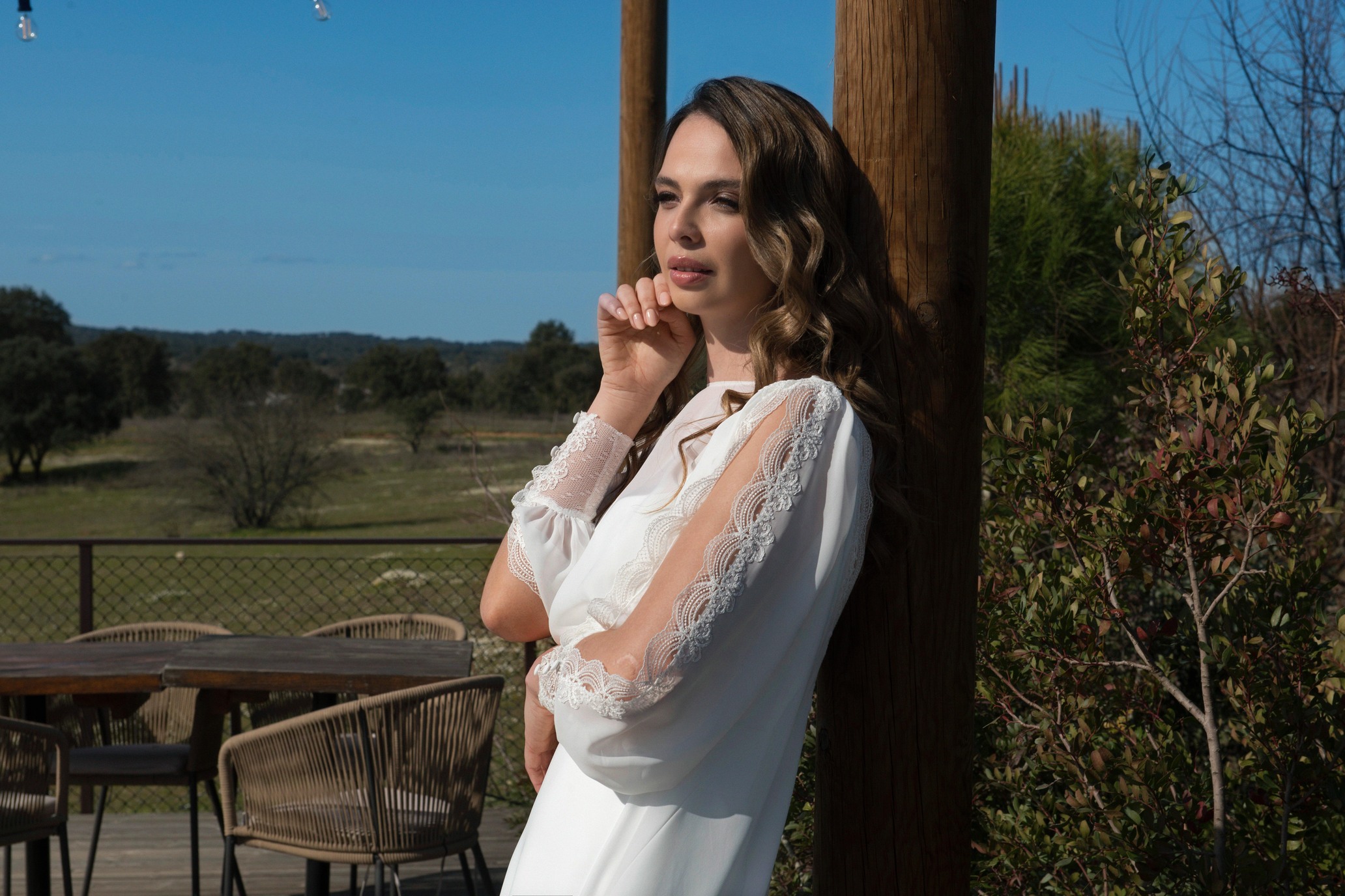 Confecionada em chiffon marfim com detalhes de renda bege, a capa do modelo 315 acrescenta fluidez e elegância ao coordenado, criando um visual distinto e envolvente.
