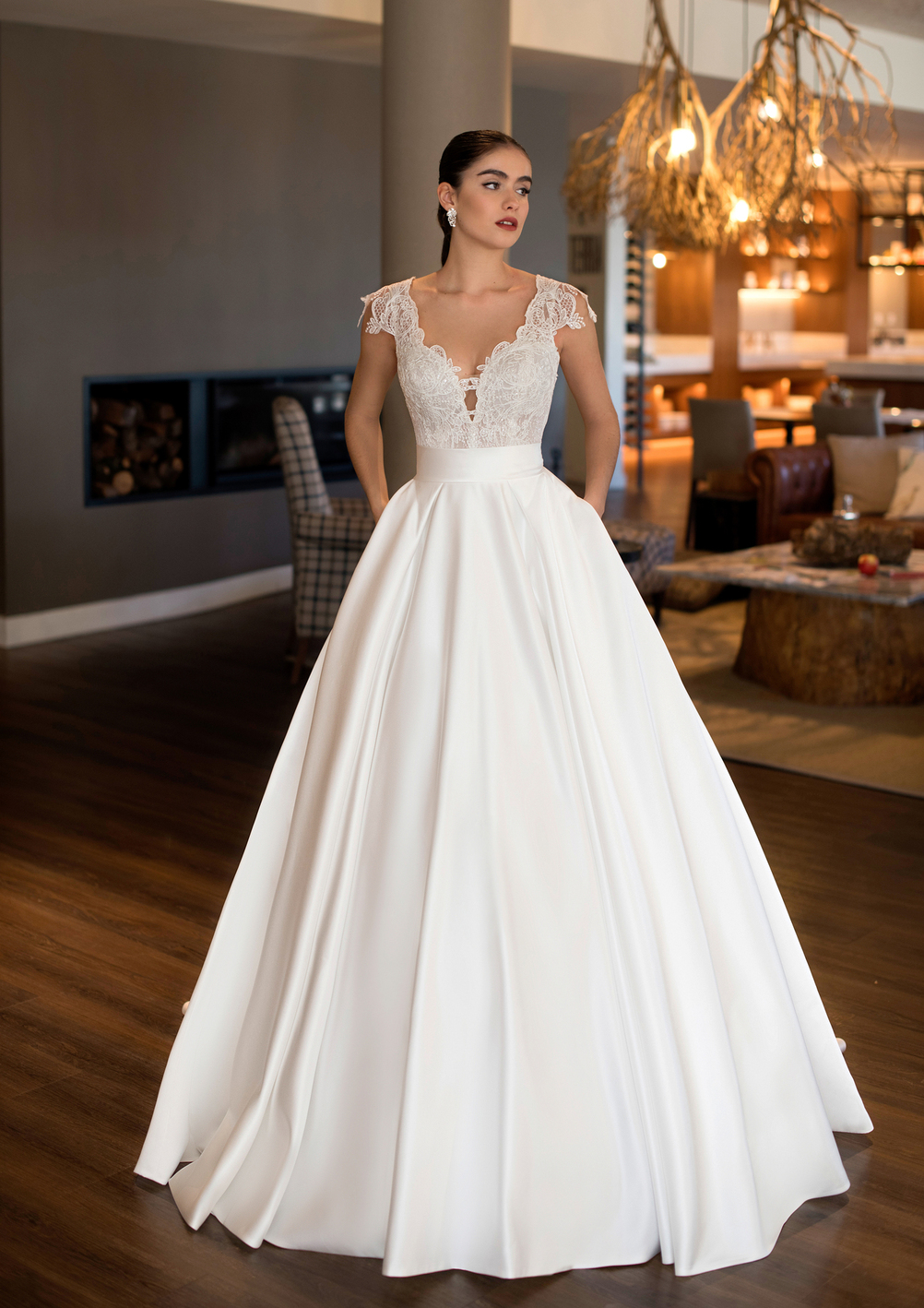 Confecionado em cetim e renda, destaca-se pelas aplicações delicadas no corpete e pela saia volumosa, que confere fluidez ao caminhar e um toque cenográfico ao visual.