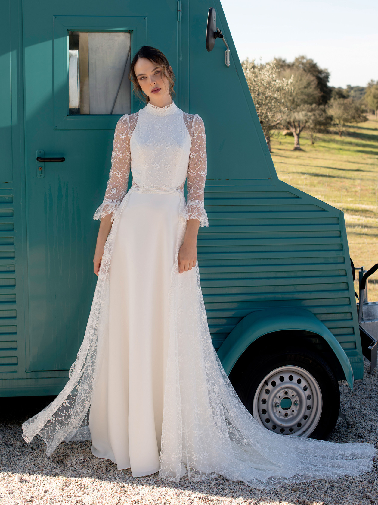 Confecionado em crepe mate e renda na tonalidade marfim, o modelo 303 destaca-se pela sua silhueta fluida e discreta, que abraça a figura com naturalidade.