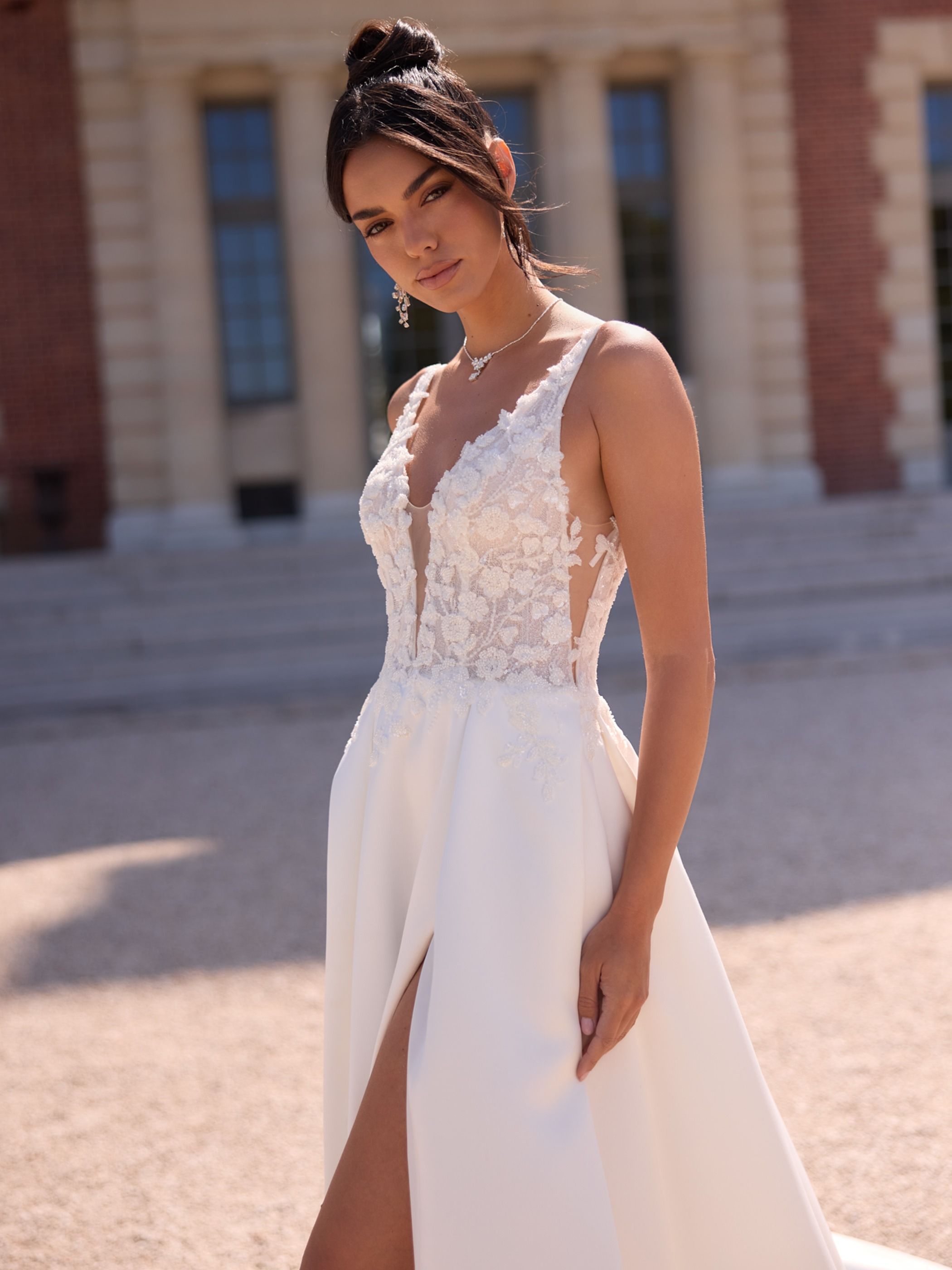 O corpete, ricamente trabalhado com flores bordadas em cristais, ilumina o look com subtileza e sofisticação. Sem mangas, apresenta um design moderno que valoriza os ombros e alonga a silhueta, complementado por uma cintura natural que define a forma de forma harmoniosa.