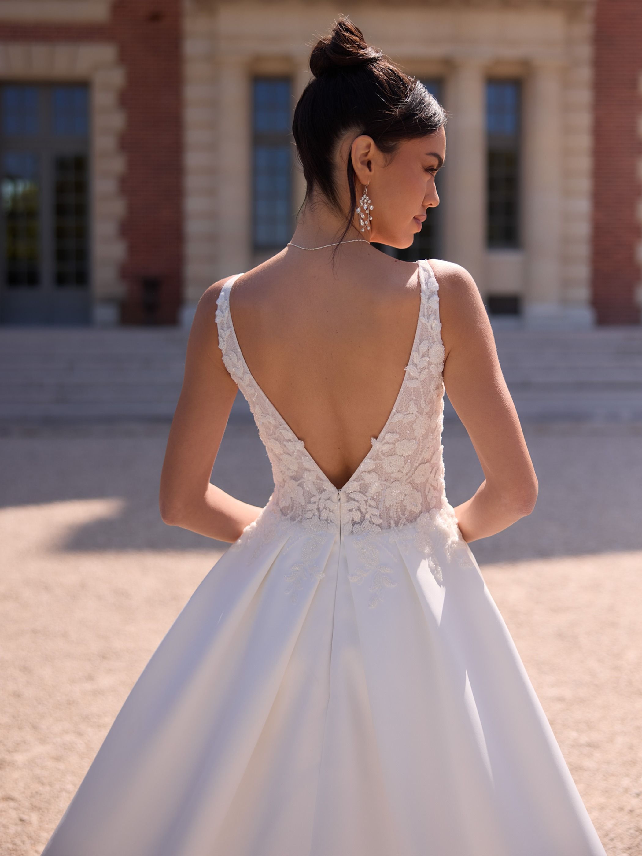 O decote em V na frente e nas costas confere leveza e feminilidade, enquanto a longa cauda acrescenta um toque régio, ideal para noivas que procuram um visual marcante e intemporal.
